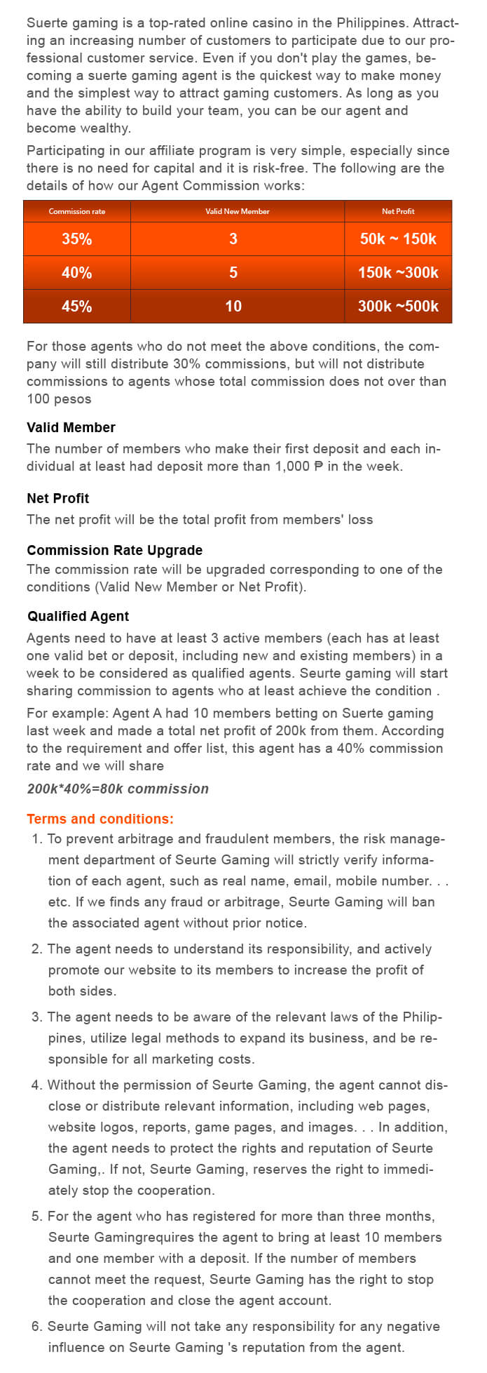 Suerte Gaming's customer service will track the members under the agent and observe their betting status. Members under the agency system must agree to and abide by suerte Gaming's membership regulations, policies and operating procedures.